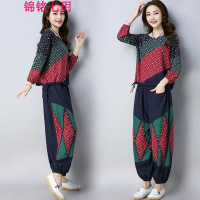 锦铭七玥2018春季新款民族风女装棉麻套装大码撞色上衣贴布灯笼裤两件套装