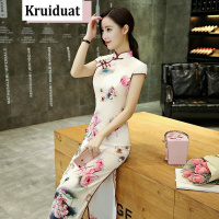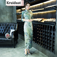 莞馨花色连衣裙高腰立领2017年夏季五分袖中长款印花气质修身时尚