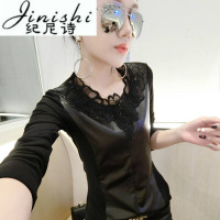 纪尼诗2018秋冬新款加绒加厚网纱拼修身显瘦蕾丝花边打底衫长袖黑色
