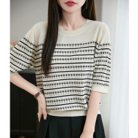 冰丝莱赛尔圆领针织衫短袖T恤女年春夏新款镂空拼色条纹上衣