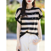 夏季新款女装曲珠冰麻丝短袖女针织衫T恤女圆领宽条纹撞色