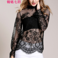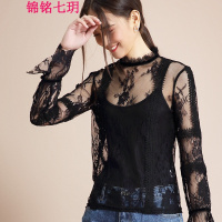 锦铭七玥2018春季新款喇叭袖上衣长袖小衫立领性感蕾丝衫单层打底衫女