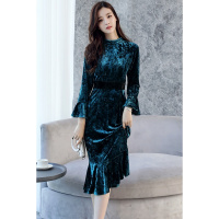 莞馨2017秋季新款女装时尚气质显瘦收腰圆领金丝绒鱼尾裙连衣裙