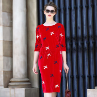 秋季新款女装 欧美秋装连衣裙金丝绒刺绣中长款抽绳A字裙子