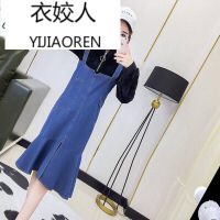 衣姣人(YIJIAOREN)韩版2018秋季新款韩版时尚潮流金丝绒套头长袖上衣女+牛仔背带包臀长裙两件套均码