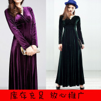 春秋季大码女装欧美长袖V领长款大摆拖地金丝绒长裙连衣裙
