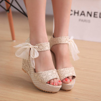 韩版坡跟防水台鱼嘴凉鞋女夏季2017中跟学生厚底松糕鞋女鞋白色鞋1521199139407