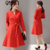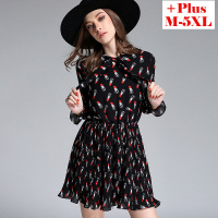 早秋新款韩版秋季领口系带口红印花高腰长袖连衣裙胖MM裙