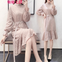 冬装新款连衣裙女韩版名媛气质立体花朵系带收腰长款蕾丝连衣裙潮