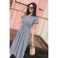 夏季新款韩版中长款高腰格子系带连衣裙女学生宽松A字裙