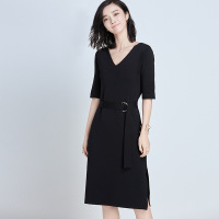 2018春季新款女装韩版V领系带针织连衣裙高腰五分袖侧开叉长裙CYLLDSJ