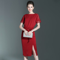 雪纺连衣裙女短袖新款韩版系带中长款气质收腰镂空开叉裙