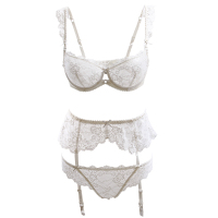 女士夏季性感内衣薄透明蕾丝3件套吊袜带丁字裤诱惑文胸套装