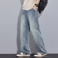 男士宽松直筒牛仔裤 渐变水洗浅蓝 侧缝口袋 显瘦垂坠感阔腿长裤