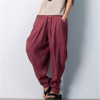 安娅诗休闲裤秋季新款文艺范民族风棉麻哈伦休闲长裤女松紧腰宽松显瘦萝卜裤