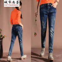 漆点小脚牛仔裤女松紧腰长裤破洞宽松显瘦哈伦裤新款
