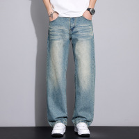 基础款斜纹牛仔裤男 复古水洗猫须裤 宽松阔腿直筒休闲长裤