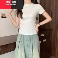 YIBUSHENG2024新款设计感小众独特别致上衣大码胖mm遮肉正肩短袖白色T恤女