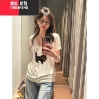 YIBUSHENG季大领口宽松休闲白色正肩上衣服新设计感小众V领短袖T恤女