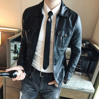 秋冬修身短款翻领水洗皮衣韩版休气男装夹克潮流时尚机车外套黑色