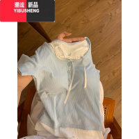 YIBUSHENG蓝色短袖正肩t恤女蝴蝶结2024季新款修身显瘦收腰短款好看上衣