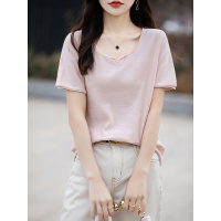 夏季新款棉线针织短袖女V领开口卷边T恤衫百搭宽松显瘦全棉上衣