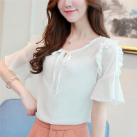 薇侣2017新品柔美雪纺衫女喇叭袖圆领百搭打底雪纺上衣潮
