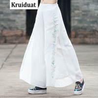 Kruidvat2017春新款民族风女装棉麻仙女范手工盘扣绣花阔腿裤长裤A860B015白