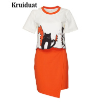 Kruidvat夏季新款女装猫咪绣花短袖不规则半身短裙B092白+橙