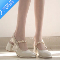 聚范裸色粗跟方头单鞋女一字带皮玛丽珍女鞋复古白色低跟高跟鞋女秋