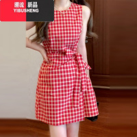 YIBUSHENG法式红色格子无袖背心连衣裙女季2024新款显瘦气质海边度假短裙