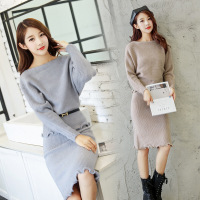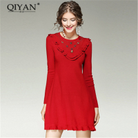 2017秋季新款钉珠修身显瘦长袖针织连衣短裙包臀毛衣裙高腰时尚女装半身裙红色