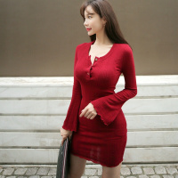秋冬打底裙针织弹力性感气质简约喇叭袖显瘦包臀短裙连衣裙枣红色