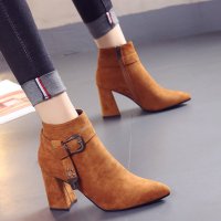 欧美2017秋冬季粗跟铆钉短靴女尖头马丁靴皮带扣加绒高跟女靴棉鞋