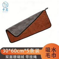 千苏 RH3030 家政保洁抹布双面珊瑚绒带挂绳擦车巾 黄色30*30cm 5条装 500g/㎡