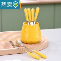 敬平水果叉子家用套装收纳罐儿童安全咖啡勺小勺子甜品叉水果签果插 稻香黄收纳罐+2勺+4叉