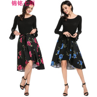 莞馨(wanxin)新款2016秋新款韩版拼接裙荷叶领长袖上衣中长款半身连衣裙修身显瘦女