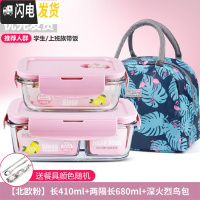 三维工匠微波炉饭盒套装学生分隔玻璃加热碗保鲜盒上班族保温便当餐盒日式 [北欧粉]长410+两隔长680+深火烈鸟包+餐具