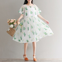 夏新款文艺小清新中长款仙人掌印花两件套短袖宽松连衣裙女
