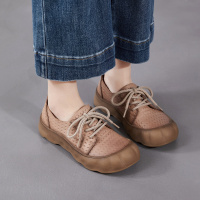 编织压花复古系带单鞋2026年春季新款舒适休闲平软底真皮丑萌女鞋
