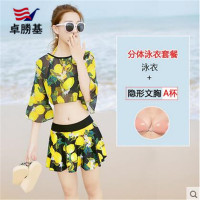 卓勝基女士泳装柠檬印花三件套性感水果印花裙式分体泳衣脖子系带防嗮衣时尚泳装泳衣+A杯硅胶胸