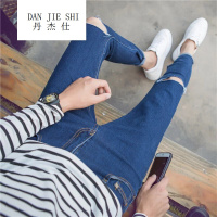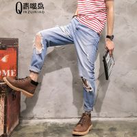 尊首新款2017春夏季男士乞丐风破洞九分牛仔裤日系复古宽松直筒牛仔9分裤子潮779浅蓝色