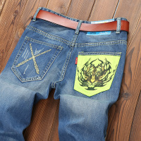 港仔文艺范2018时尚男装破洞牛仔裤男青修身直筒小脚裤子刮烂乞丐长裤潮男皮带裤