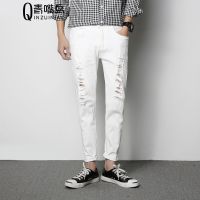 尊首新款2017男士薄款破洞牛仔裤个性时尚马裤2017夏季新款薄款韩版潮流九分裤