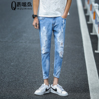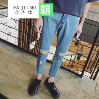 港仔文艺范2018时尚男装男款港仔青少破洞修身牛仔裤男韩版休闲夏季小脚九分裤男士学生潮男8616破洞裤