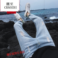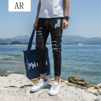 潮至男士秋季新款2017九分裤牛仔裤韩版潮修身破洞休闲裤子乞丐裤薄款修身小脚哈伦裤