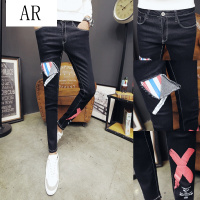 AR潮流黑色破洞裤男个性贴布紧身小脚裤修身弹力印花牛黑色