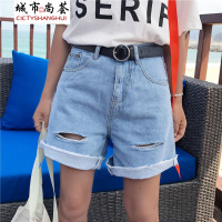 新款高腰卷边牛仔短裤女学生百搭宽松显瘦阔腿破洞裤子