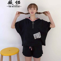 新款条纹短袖连帽T恤休闲运动套装女跑步健身运动长裤休闲裤套装