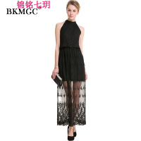锦铭七玥2018夏季新款欧美露肩修身绣花蕾丝连衣裙挂脖酒会礼服裙